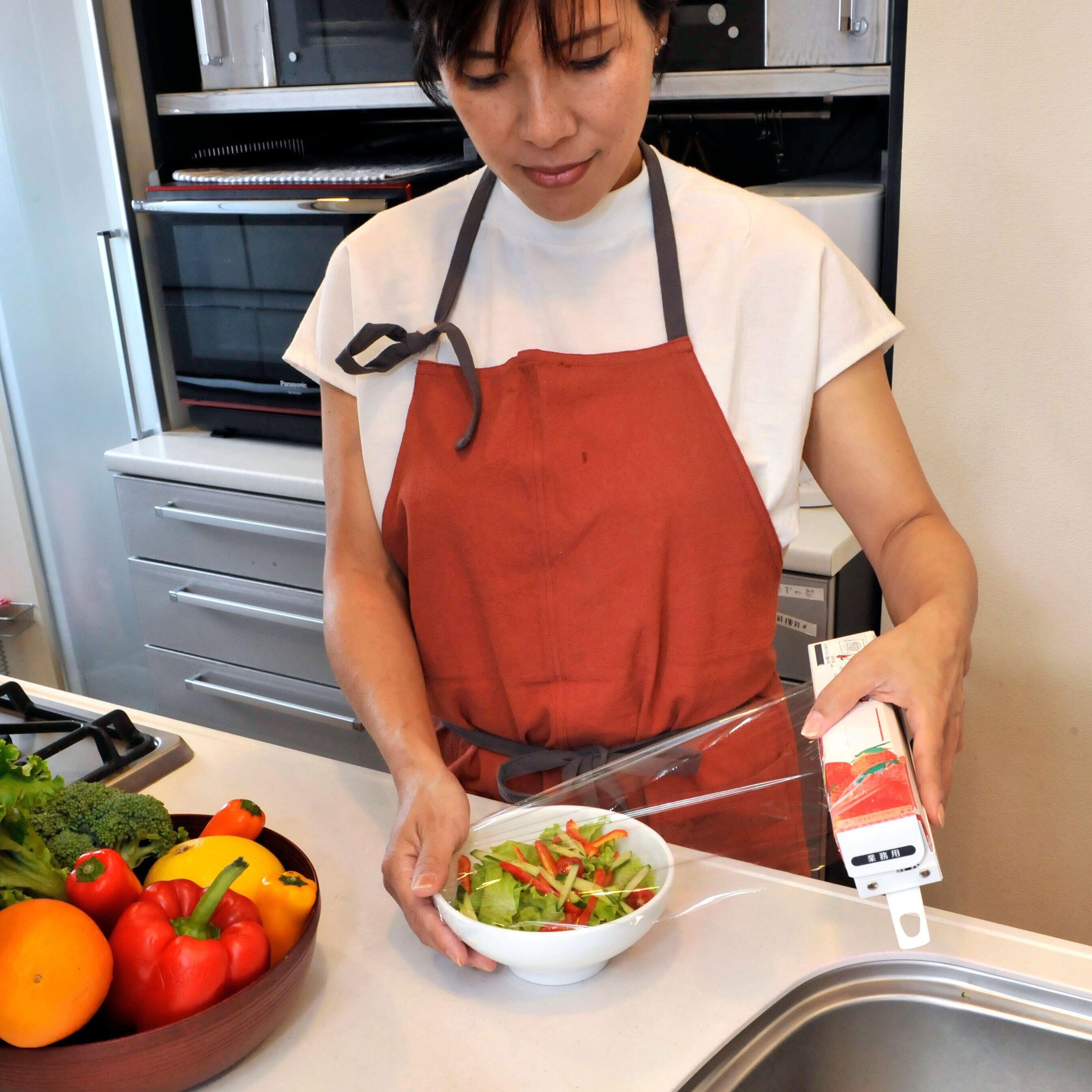 ※全て市販ラップに対し「巻き戻らない!」を保証するものではありません。特にポリエチレン(PE)系フィルム(安価なラップ)は、くっつき難いためカットする際は、親指でフィルムが密着するように押さえるのがコツです。